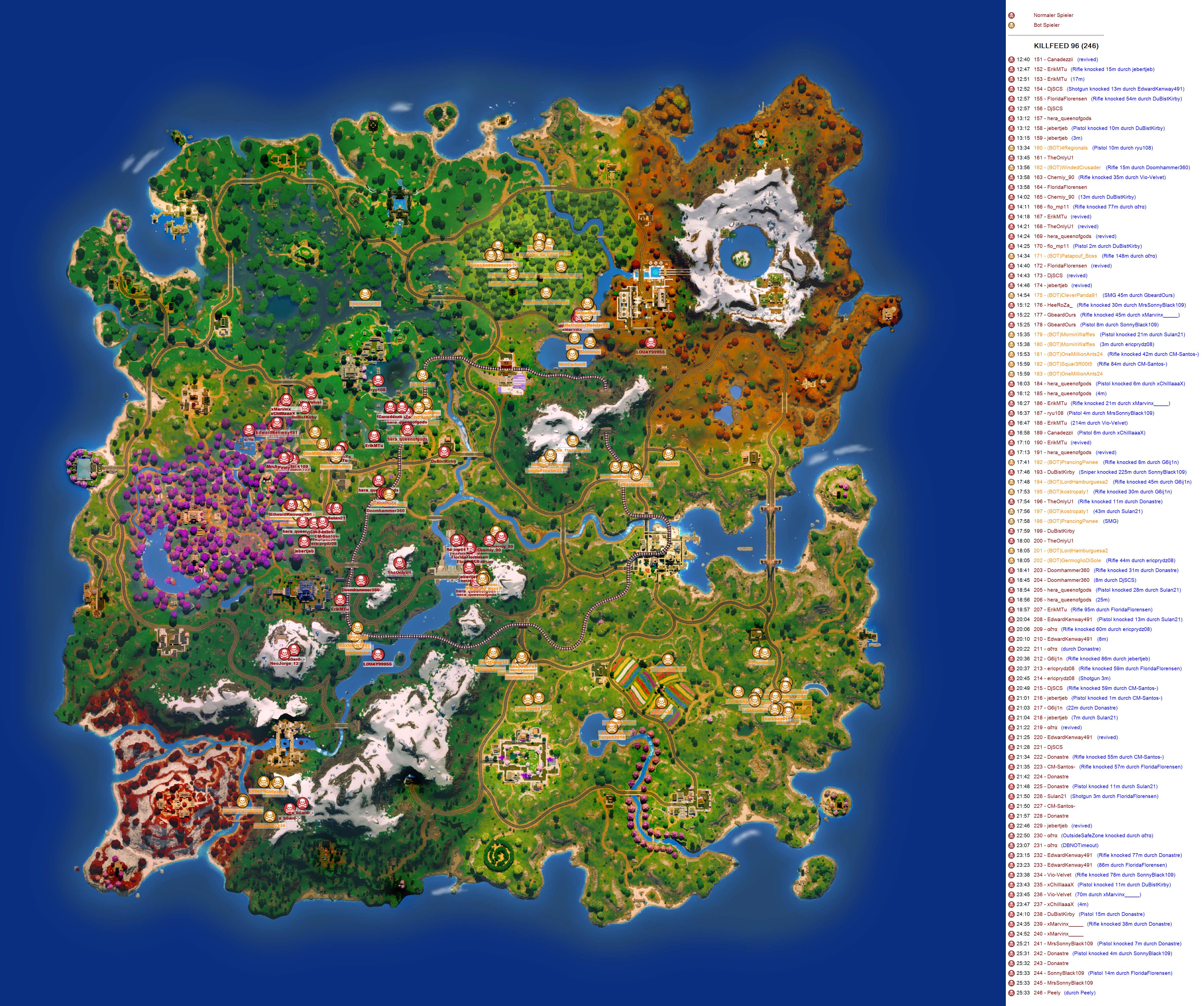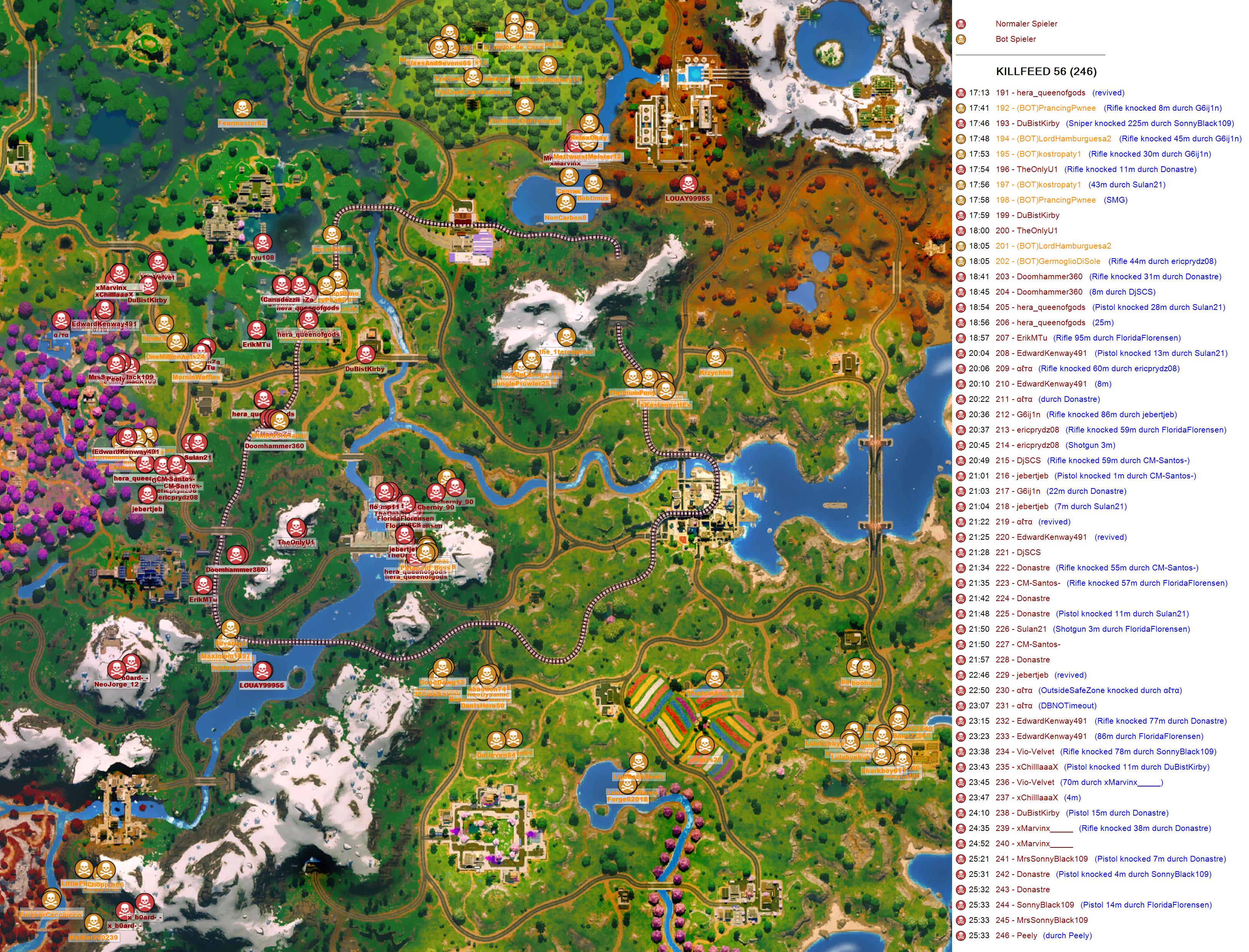 SPIELER / EPICID | LEVEL | KILLS | PLATZ | PLATTFORM | REBOOT | DANKE | ANONYM | TOD | ZEIT GELEBT | SKIN GLEITER PICKAXE |
